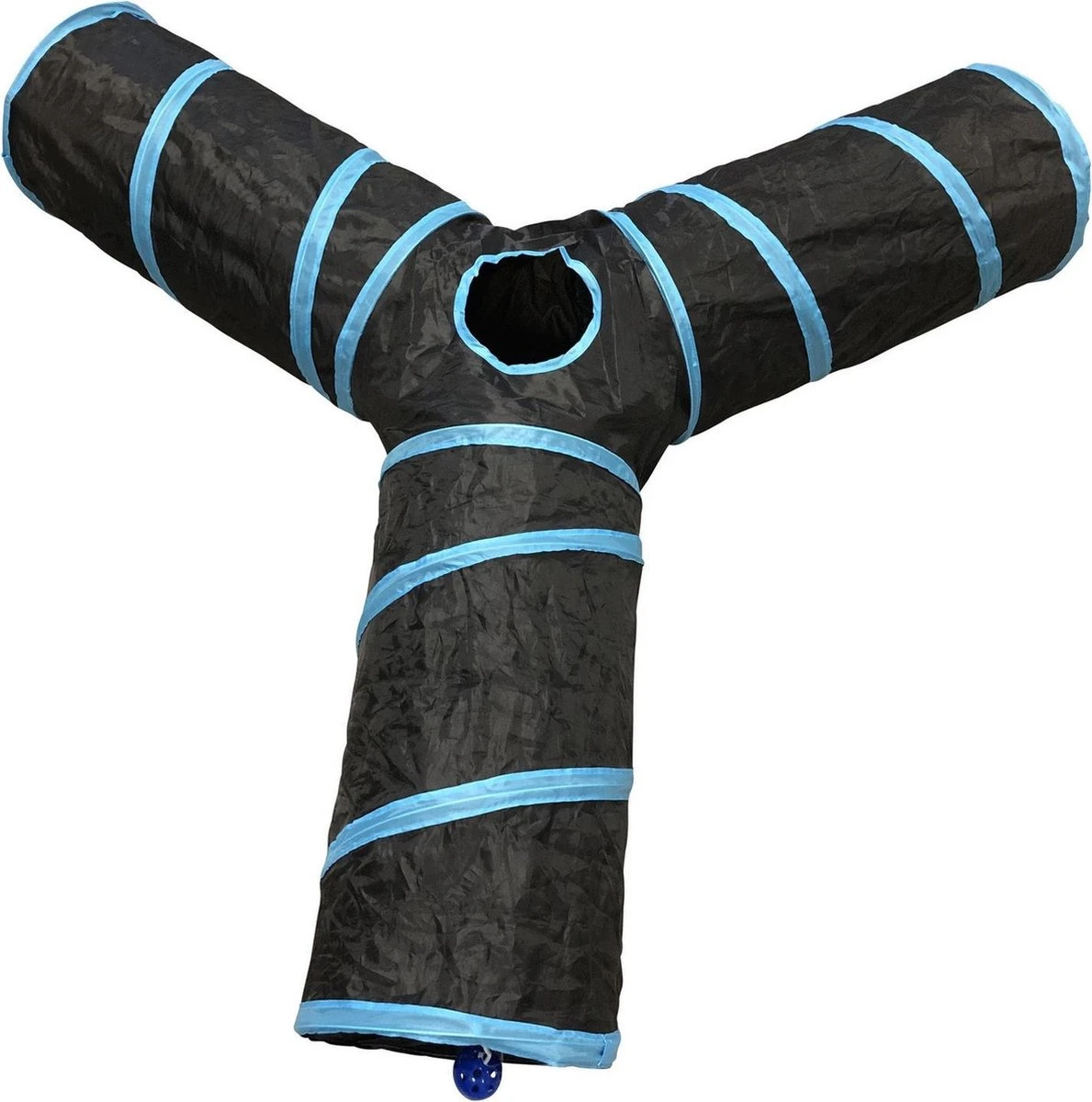 De tunnel heeft drie buizen die in het midden samenkomen. Ook in het midden zit een gat waar je kat in en uit kan springen. Een extra balletje aan het uiteinde van de tunnel zorgt voor nog meer speelplezier. Door de vele speelmogelijkheden is deze tunnel ook ideaal voor huishoudens met meerdere katten waarbij ze lekker achter elkaar aan kunnen jagen door de tunnels heen.