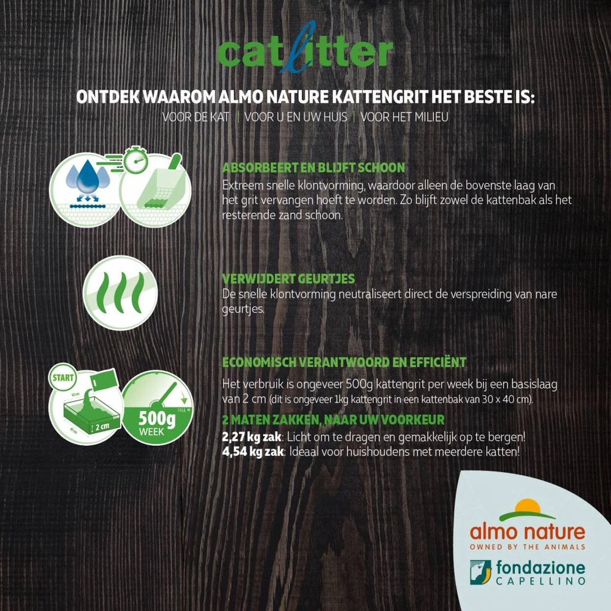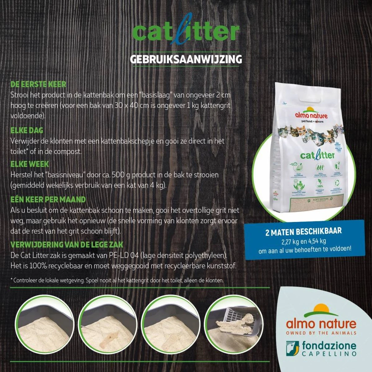 Herstel wekelijks de basis laag door bij te vullen met 1/4 zak / 500g Almo Nature kattengrit.