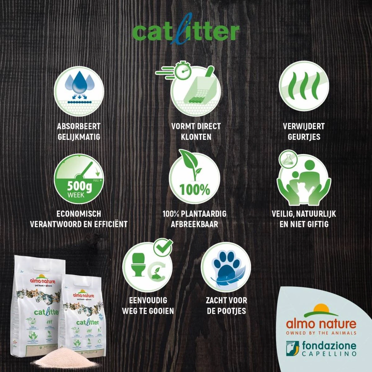 Extreem snelle klontvorming waardoor alleen de bovenste laag van het Almo Nature kattengrit vervangen hoeft te worden. Hierdoor blijft zowel de kattenbak als de resterende kattenbakvulling schoon.