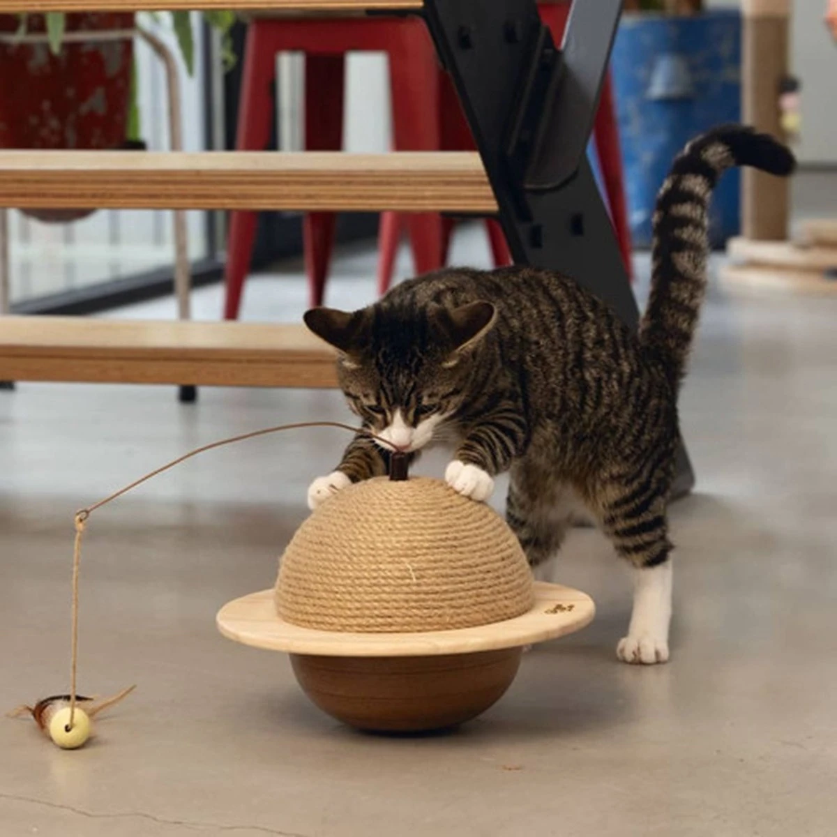 De Designed by Lotte Krabbol Wiggly is een echt design item voor in je huis, waaraan jouw kat veel krabplezier kan beleven! Wiggly is gemaakt van rubberhout, wat mooi lichtcremig van kleur is. De bal is afgewerkt met jute touw. Jouw kat zal het leuk vinden om met het speelveertje te spelen of aan de bal te krabben. Een extra speelelement wordt vanzelf toegevoegd zodra jouw kat gaat spelen, want dan zal de bal zal heen en weer wiebelen. Met deze krabbol doe je niet alleen jouw kat een plezier, maar het staat ook echt fantastisch in je interieur!