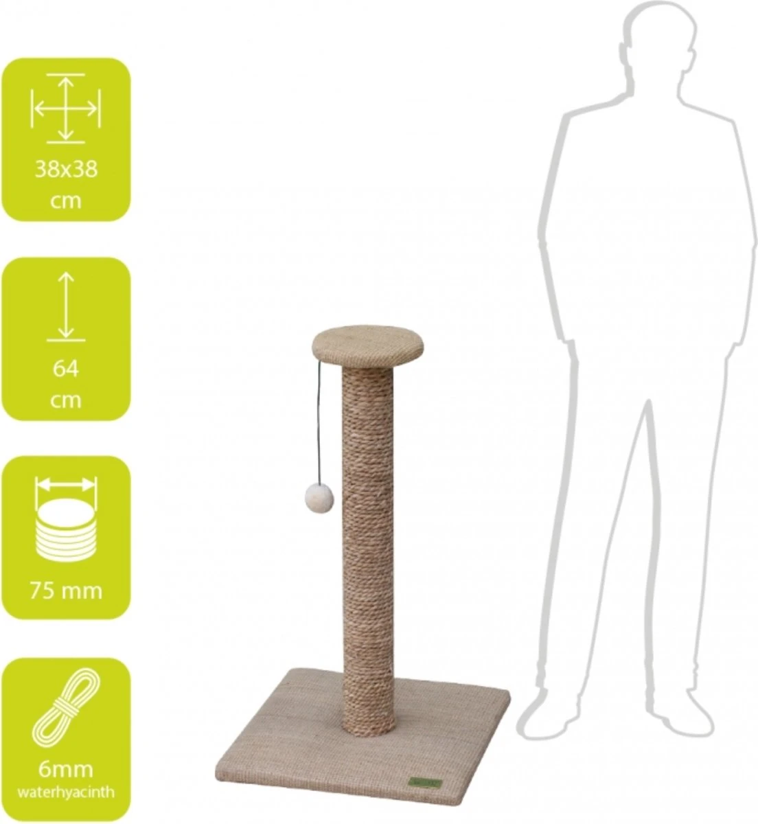 Verwen jouw kat met deze eenvoudige maar erg speelse krabpaal! Het balletje dat aan de bovenkant is bevestigd activeert het jagersinstinct. De paal is eenvoudig in elkaar te zetten. De krabpaal is gemaakt van waterhyacint bladeren en zacht en scheurvast, gelijmd natuursisal. Deze krabpaal past in elk interieur!