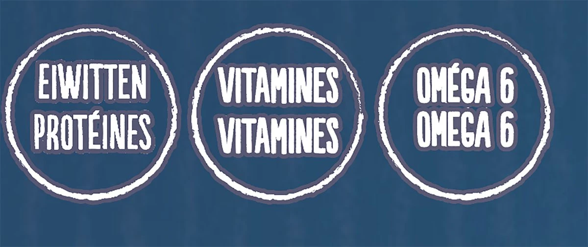 | Analytische bestandsdelen | Analytische bestanddelen: Eiwit: 36,0%, Vetgehalte: 16,0%, Ruwe as: 9,0%, Ruwe celstof: 1,5%, omega 6-vetzuren: 1,8%, Energiewaarde: 408/100kcal/g. |
