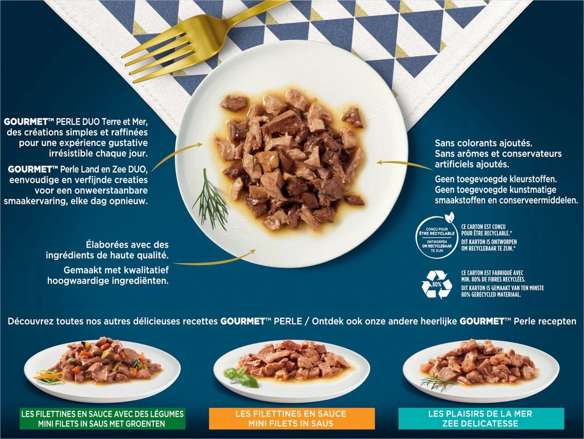 GOURMET™ Perle DUO, eenvoudige en verfijnde creaties voor een onweerstaanbare smaakervaring, elke dag opnieuw. Alle GOURMET™ Perle DUO recepten zijn gemaakt met kwalitatief hoogwaardige ingrediënten en bevatten geen toegevoegde kleurstoffen, geen toegevoegde kunstmatige smaakstoffen en geen toegevoegde kunstmatige conserveermiddelen. Deze kartonnen / plastic verpakking is ontworpen om recyclebaar te zijn. De beschikbare recycling mogelijkheden van de kartonnen / plastic verpakking kunnen per land verschillen. Kijk voor uw land op onze website: https://www.purina.eu/packaging