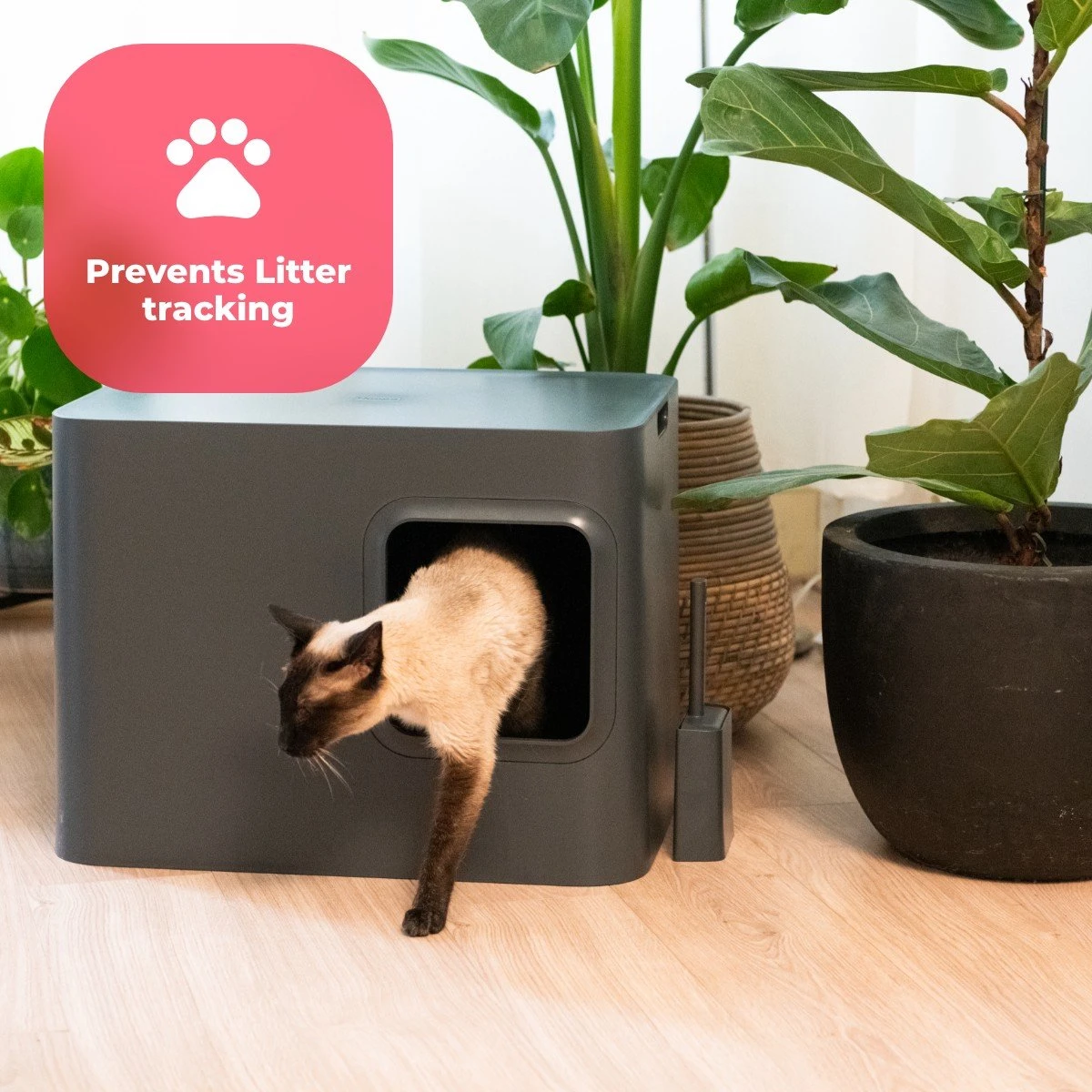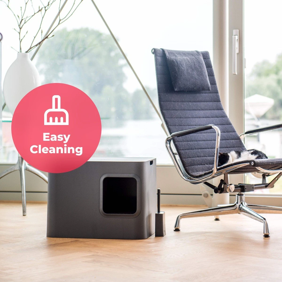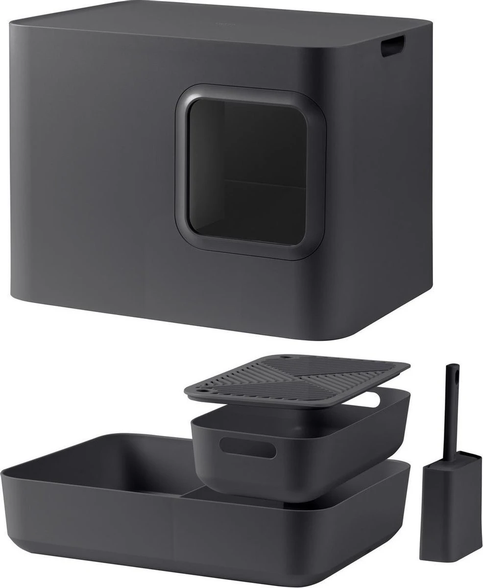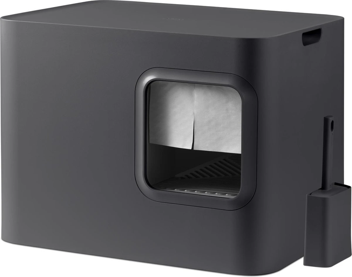 De Dome heeft een modern design dat naadloos in je interieur past. Plaats een vaas op de Dome of een stapel boeken. De scheidingswand zorgt ervoor dat je niet in de kattenbak kijkt en de kattenbakvulling ziet.