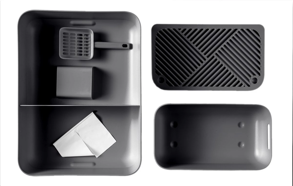 Dankzij de lekbak valt het grit dat onder de poten van uw kat vastzit in de kleine container zodat er minder gruis over de vloer wordt verspreid. Leeg de kleine container eenvoudig en om de dag in de vuilbak.