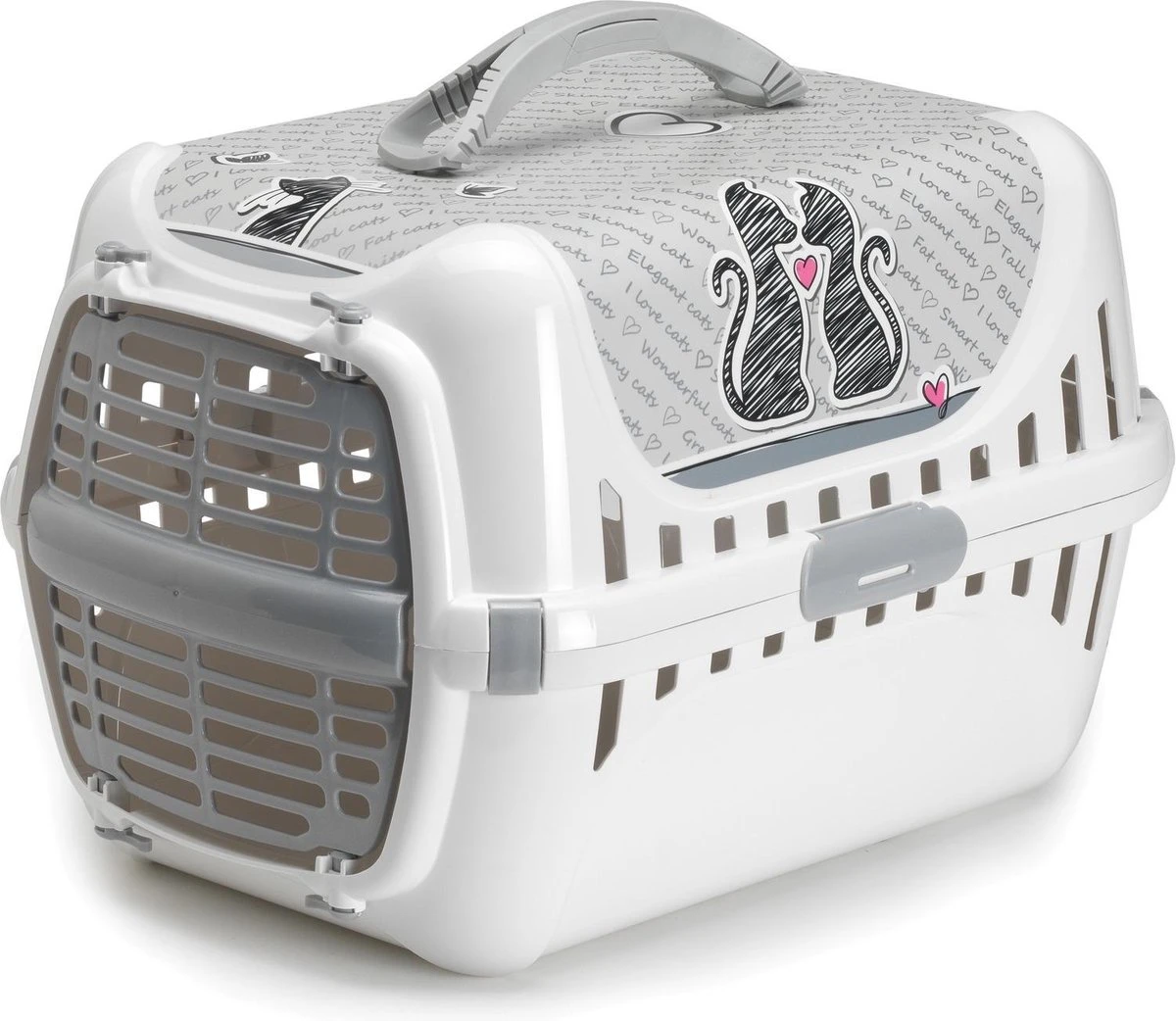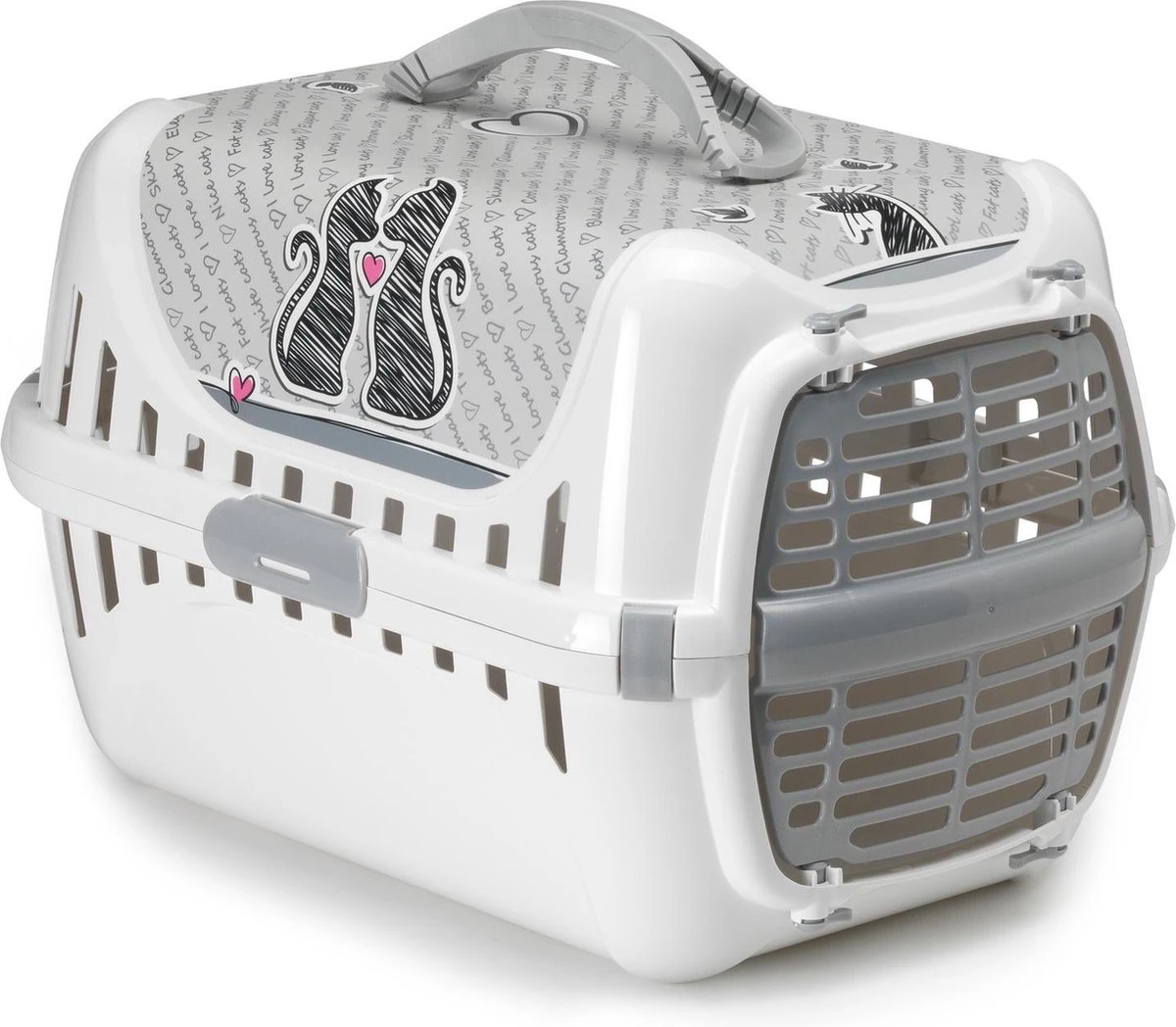 Laat jouw kat prettig reizen met de Trendy Cat Cats in Love transportbox. De moderne transportbox heeft een leuk, trendy design met romantische teksten en leuke afbeeldingen van verliefde katten.