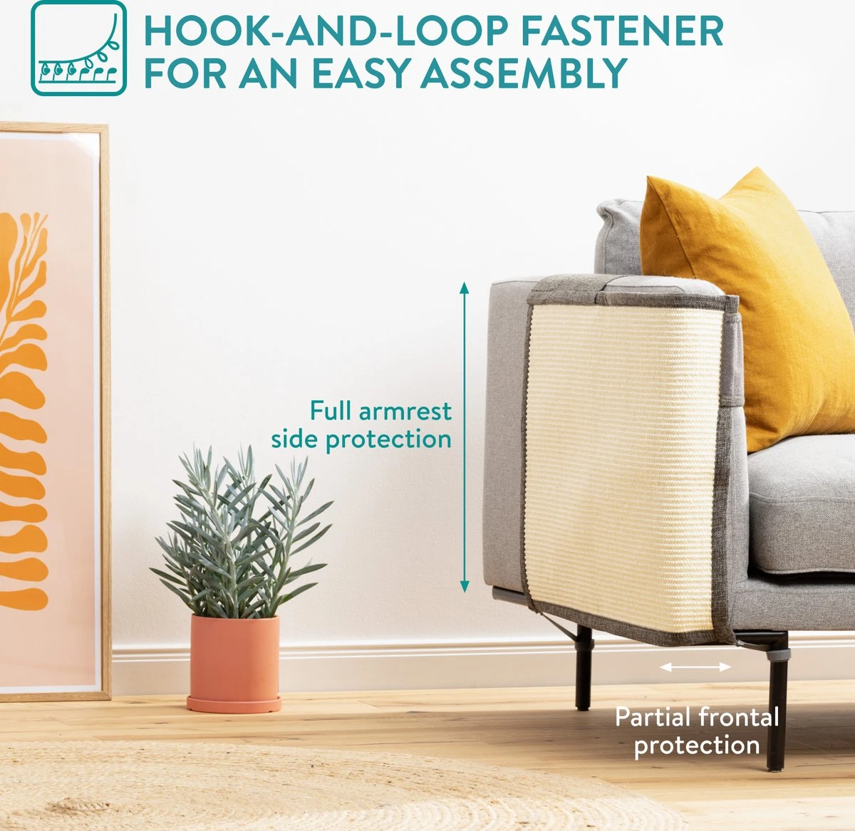 - KLAUWVERZORGING: De ene helft van de mat is bedekt met sisal en de andere helft is van stof. Je plaatst hem over de armleuning en stopt de stoffen kant onder het zitkussen. Nu kan je kat zijn klauwen scherpen, terwijl jouw bank of stoel beschermd is.